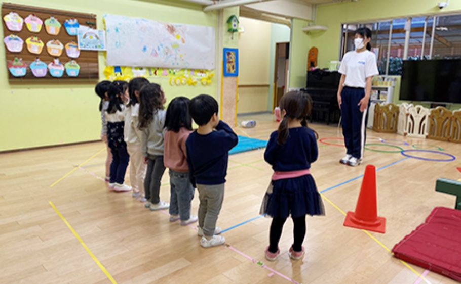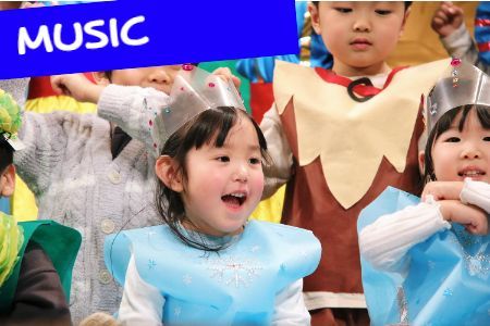 ・例えば:「Twinkle, Twinkle, Little Star」「Head, Shoulders, Knees and Toes」「きらきら星」など 簡単な振り付けもつけて記憶に残りやすい指導を行います。