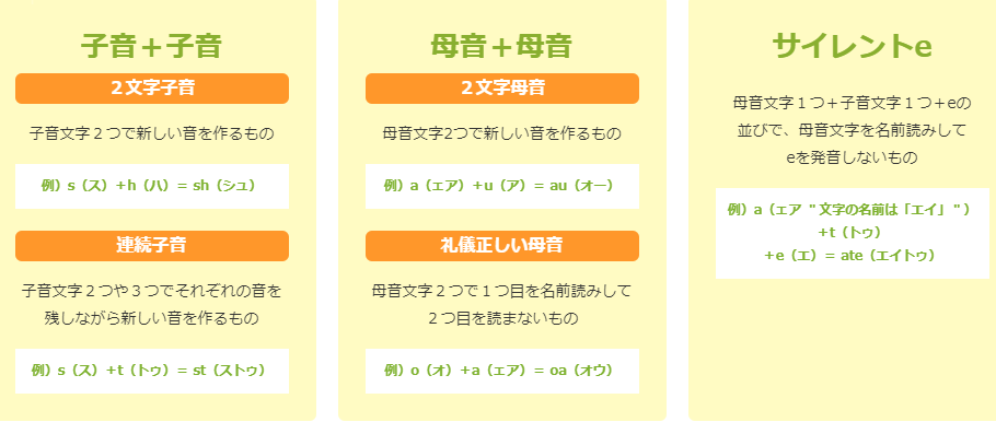 フォニックス発音一覧の読み方を基本に、上のような子音と子音が重なった場合や「e」を発音しない場合など、いくつかの独特のルールを学んでいきます。これらのルールをマスターすることで、例えばinterestingといった難しい単語でも「インタレスティング」といった具合に、「見た」だけで正しく「読める」力が備わるのです。