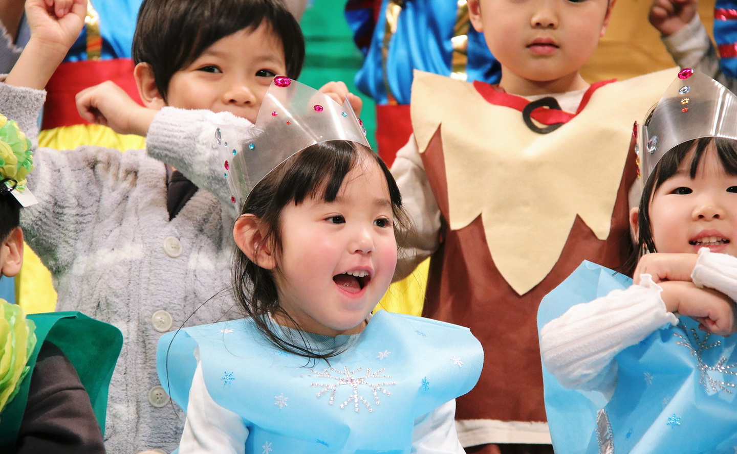 ■自己紹介の仕方や、身の回りの品物の中国語の呼び方、歌や手遊びなどを中国語で行います。年度末の発表会では、中国語での歌やダンスをステージで披露します。