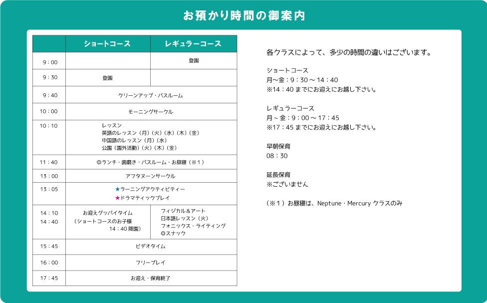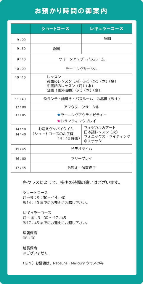 | Neptune&Mercuryクラス対象学年と週3~5日の登園日数、保育コース(ショート/レギュラー/早朝)により保育料が異なります。 |