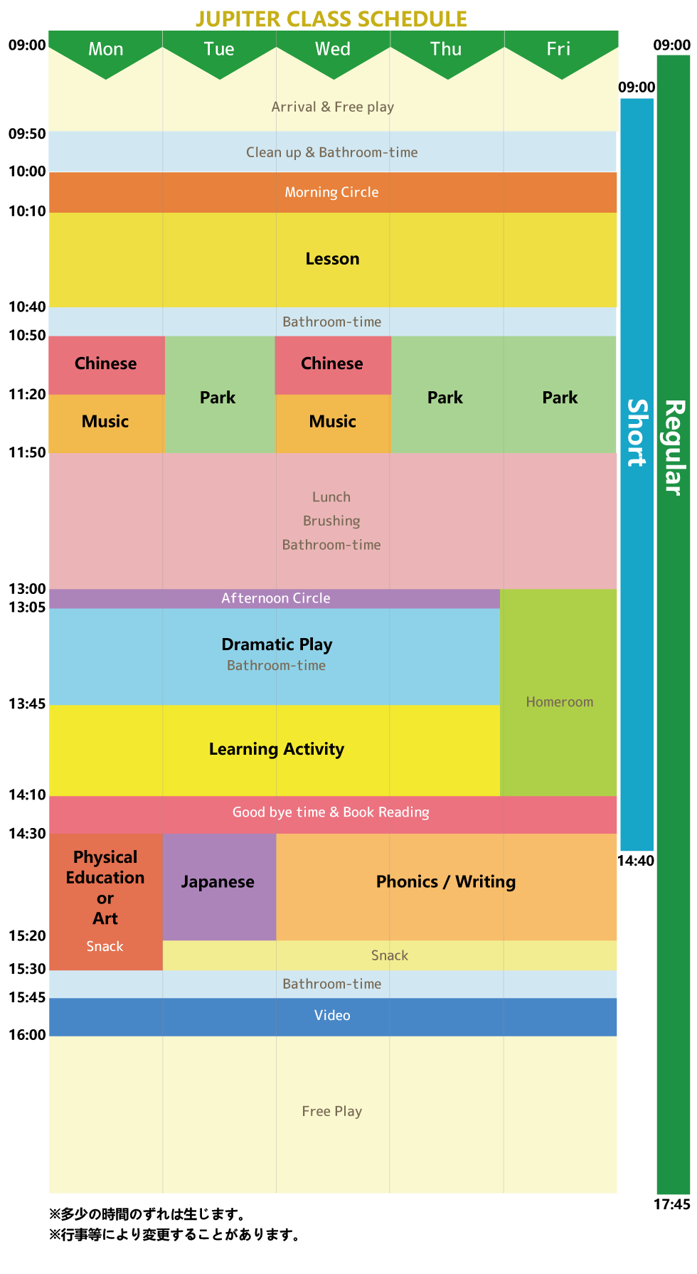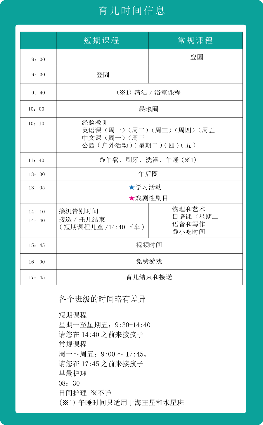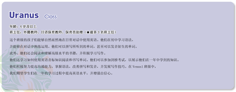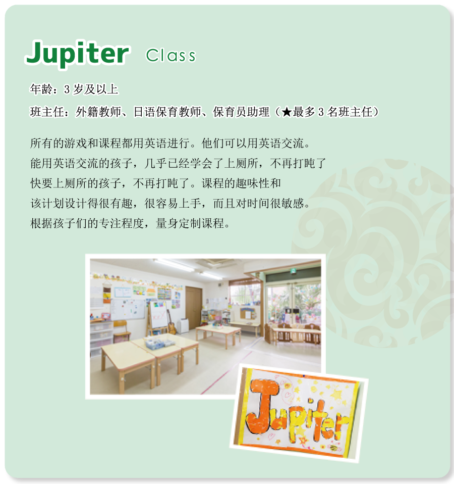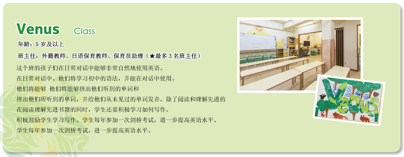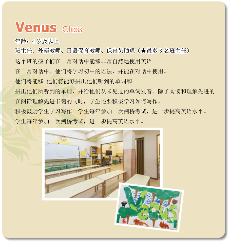 | -我们新开设了面向小学生的“课后托管学校”。此前,我们的课后学校主要面向本校毕业生,旨在保持英语能力。而如今,为了响应家长们的需求,我们扩大了招生范围,使其他幼儿园的毕业生小学生也可以参加。在本校,孩子们将在托管时间内接受丰富的课程,包括英语、中文等语言学习,以及各种娱乐活动。我们致力于为孩子们提供一个充实的学习与成长的环境。 |